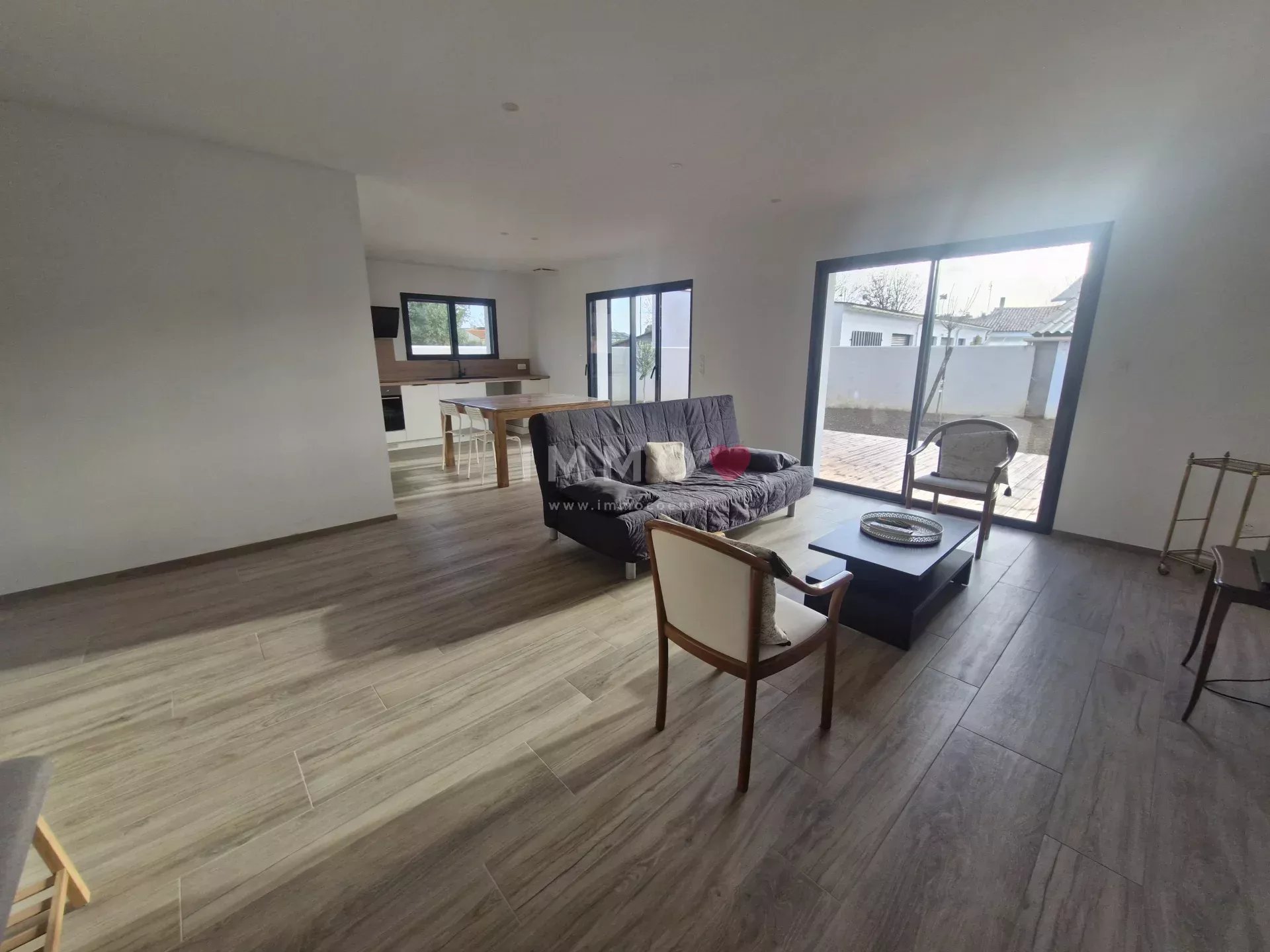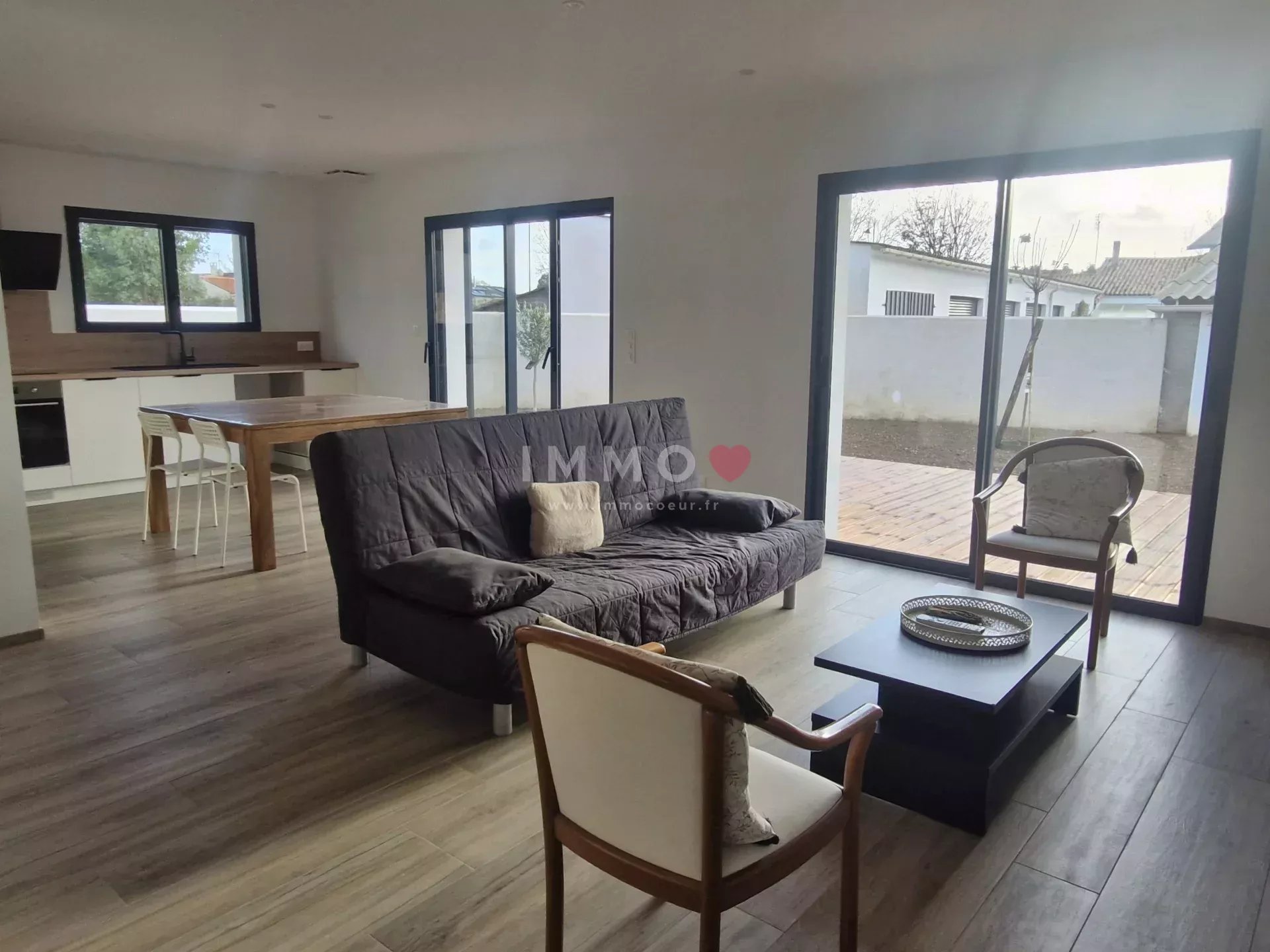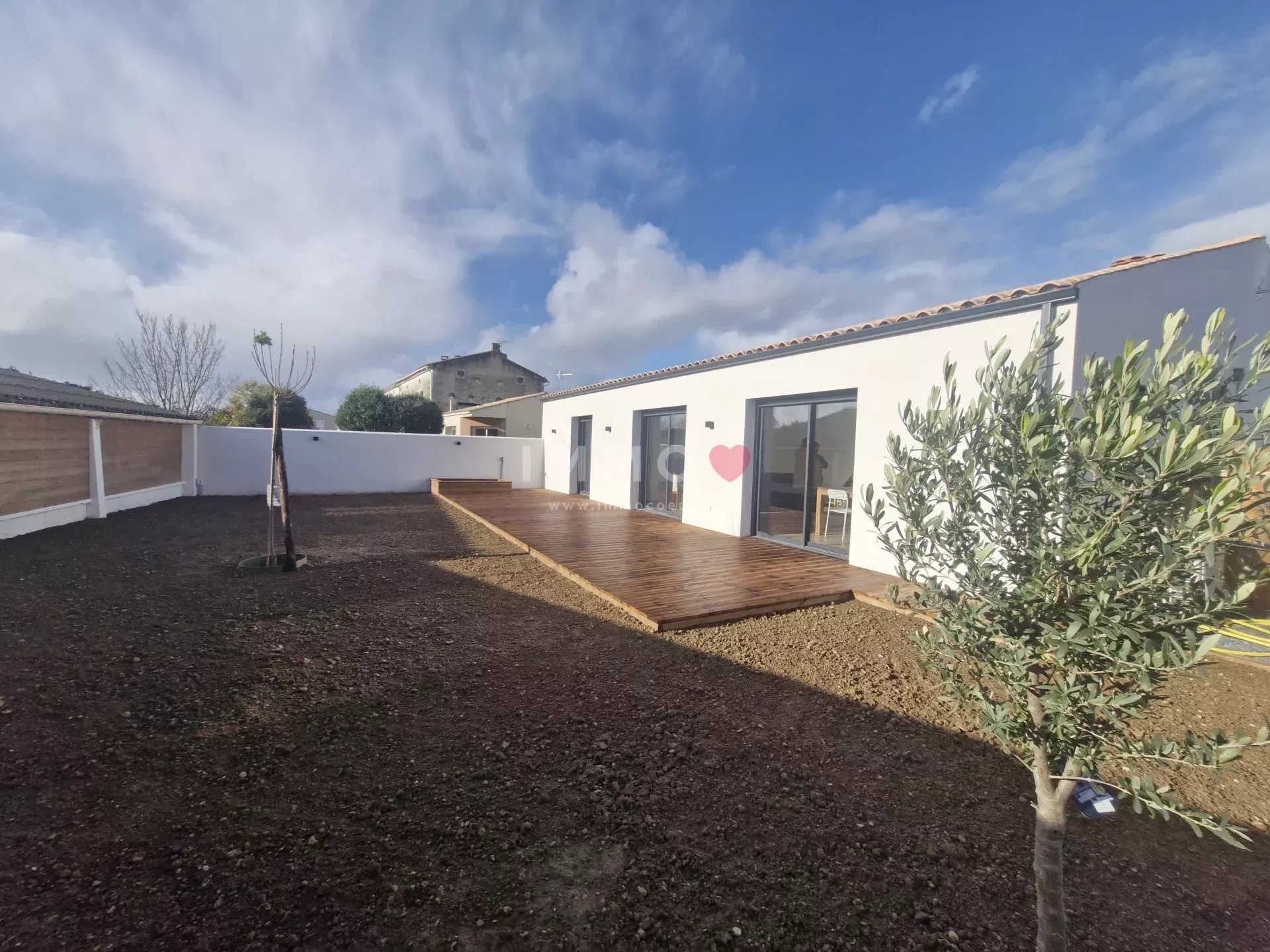 Entre LA ROCHELLE et NIORT, à FERRIERES, plain-pied neuf, meublé, offrant une belle pièce de vie exposée plein sud, cuisine ouverte aménagée et équipée, cellier, 3 chambres, salle d'eau, toilettes, garage, terrasse bois et jardin clos.