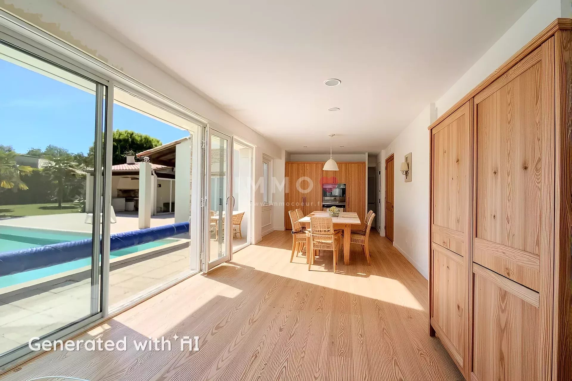 Le tout s’ouvre sur une superbe piscine qui constitue le cœur de la maison, offrant une ambiance de vacances au quotidien.